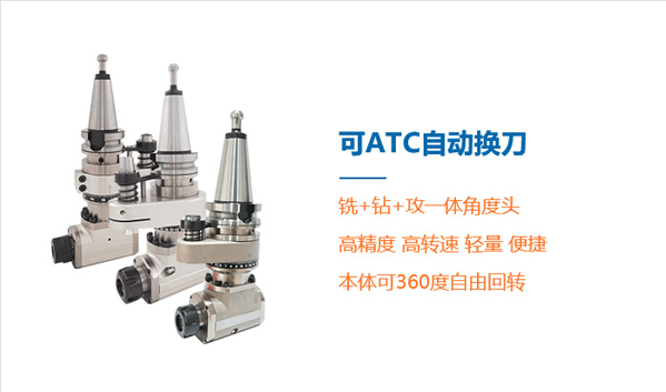 萬向角度頭屬輕型萬向銑頭——此類銑頭特點(diǎn)為質(zhì)量輕(一般10kg左右)、精度高、扭矩偏小、可進(jìn)刀庫進(jìn)行自動(dòng)換刀。此類銑頭用定位塊定位,輸出一般為筒夾,有時(shí)也有特殊的可以輸出CAT或HSK刀柄,也有部分特殊的直接連接絲攻或面銑刀。